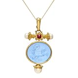 With an array of lavish materials and an exquisite design, the handmade Tagliamonte Classics 18k Yellow Gold Blue Venetian Glass Ruby Pendant is an adornment fit for royalty. The multi-part pendant starts with a 2-inch embellished cross wrought from fine 18k gold. Each side and bottom point is tipped with a shimmering freshwater pearl that goes well with the gold. At the cross's center is a small, but lovely, red ruby, which adds to the regal color scheme. A rather large light-blue Venetian-glass medallion is superimposed on the cross just below the ruby and contains a depiction of a horse and chariot. The pendant hangs on a fine 18k gold chain.